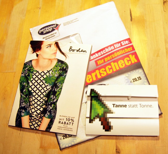 Wir bekommen nicht viel Post von Freunden und Familie aber Johnny Boden, die ADAC Motorwelt, IKEA und viele andere sorgen dafür das unser Briefkasten stets gefüllt ist, das klingt traurig oder nicht? Das finden wir auch, nicht weil unsere Freunde uns so selten schreiben, nein! Sondern weil das Unmengen von Müll sind die da jeden Monat in unseren Briefkasten flattern. Immer wieder haben wir uns darüber geärgert und uns gefragt wie manche dieser Firmen diese endlose Werbung finanzieren und vor allem wer sich das alles wirklich genau ansieht. Damit ist jetzt Schluss, ärgern war gestern. Mit etwas Zeit und Geduld und einem funktionierendem Telefon kann man dem Werbungsterror ein Ende setzten. Einfach anrufen und freundlich nein Danke sagen hat wunderbar geholfen. Ciao Johnny, Goodbye ADAC und Hallo leerer Briefkasten. Wir sind keineswegs traurig wenn die oben genannten nicht mehr vorbeischauen, im Gegenteil wir freuen uns das Zero Waste uns einen weiteren überflüssigen Weg zur Papiertonne erspart.