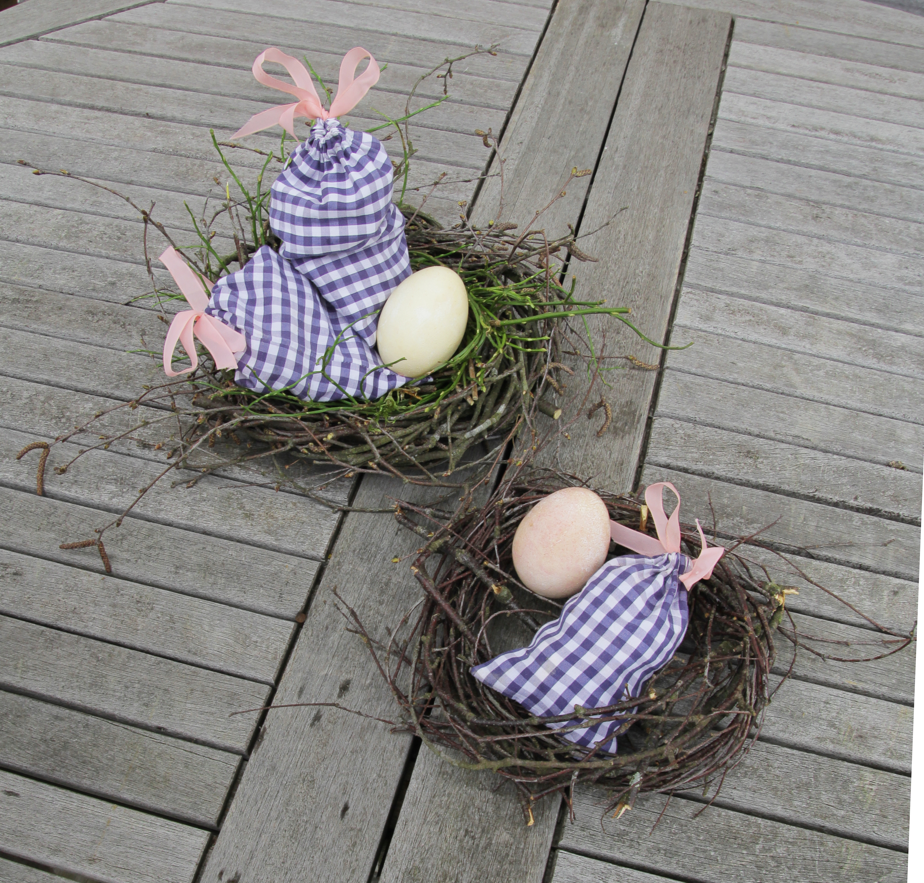 Die Säckchen sind selbst genäht aus alter Bettwäsche, die Eier gefärbt mit roter Beete und Zwiebeln, die Nester gebunden aus Heidelbeerkraut und Birkenästen. Der süße Inhalt stammt aus dem Selbstbedienungsbereich der Süßwaren Abteilung im Kaufhaus. Alles in allem kein Megaaufwand. Was ich schön daran finde, ist das alle Komponenten entweder 100% biologisch abbaubar, essbar oder wiederverwendbar sind.